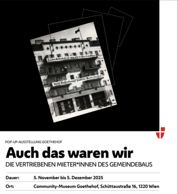 Vom 5. November bis zum 5. Dezember erzählen wir die Geschichte und Geschichten ehemaliger Bewohner*innen und fragen danach, was das mit uns heute zu tun hat. Auf allen Stiegen des Goethehofs sind anlässlich der Eröffnung temporäre Erinnerungszeichen für die aus den Wohnungen Vertriebenen angebracht.